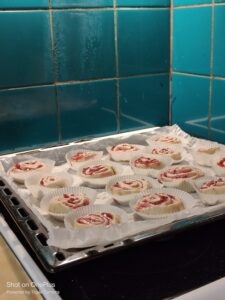 Täytetyn rullan leikkasin paloiksi ja nostin paperivuokiin leivinpellille. Koska täyte oli melko löysää laitoin leivinpaperin pullien päälle ensin ja vasta sen päälle liinan kohotuksen ajaksi. Kun pullat olivat nousseet reilun puoli tuntia, voitelin ne munalla ja paistoin n. 15 minuuttia. Paistoaika pitää aina huomioida oman uunin mukaan ja on hyvä katsoa pullien tilannetta vaikka 8 minuutin paiston jälkeen. Uunista nostetut pullat peitin vielä hetkeksi liinalla ja paistoin toisen pellillisen valmiiksi. Kun pullat olivat jonkin verran jäähtyneet, pursotin niille valmista sokerikuorrutetta, jolla sain niiden kasvot vähän ehostetuiksi.