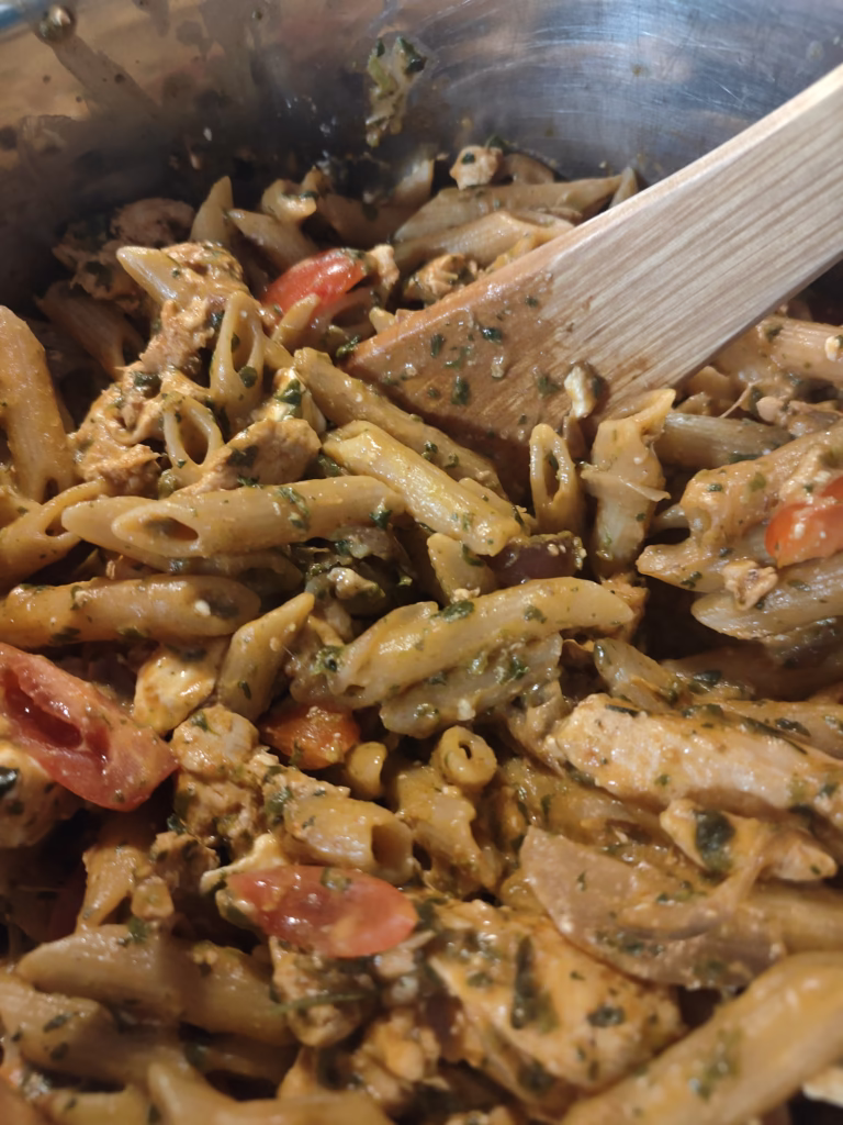 Päälle voi halutessaan ripotella korppujauhoja tai juustoraastetta – juustoa voi sekoittaa myös tuohon pasta-kananliha seokseen antamaan mehevyyttä ruualle. Tämä ruoka on väsyneen työstä kotiin palaneen äidin tai isän pelastus. Ruoka valmistuu vähän kuin itsestään.