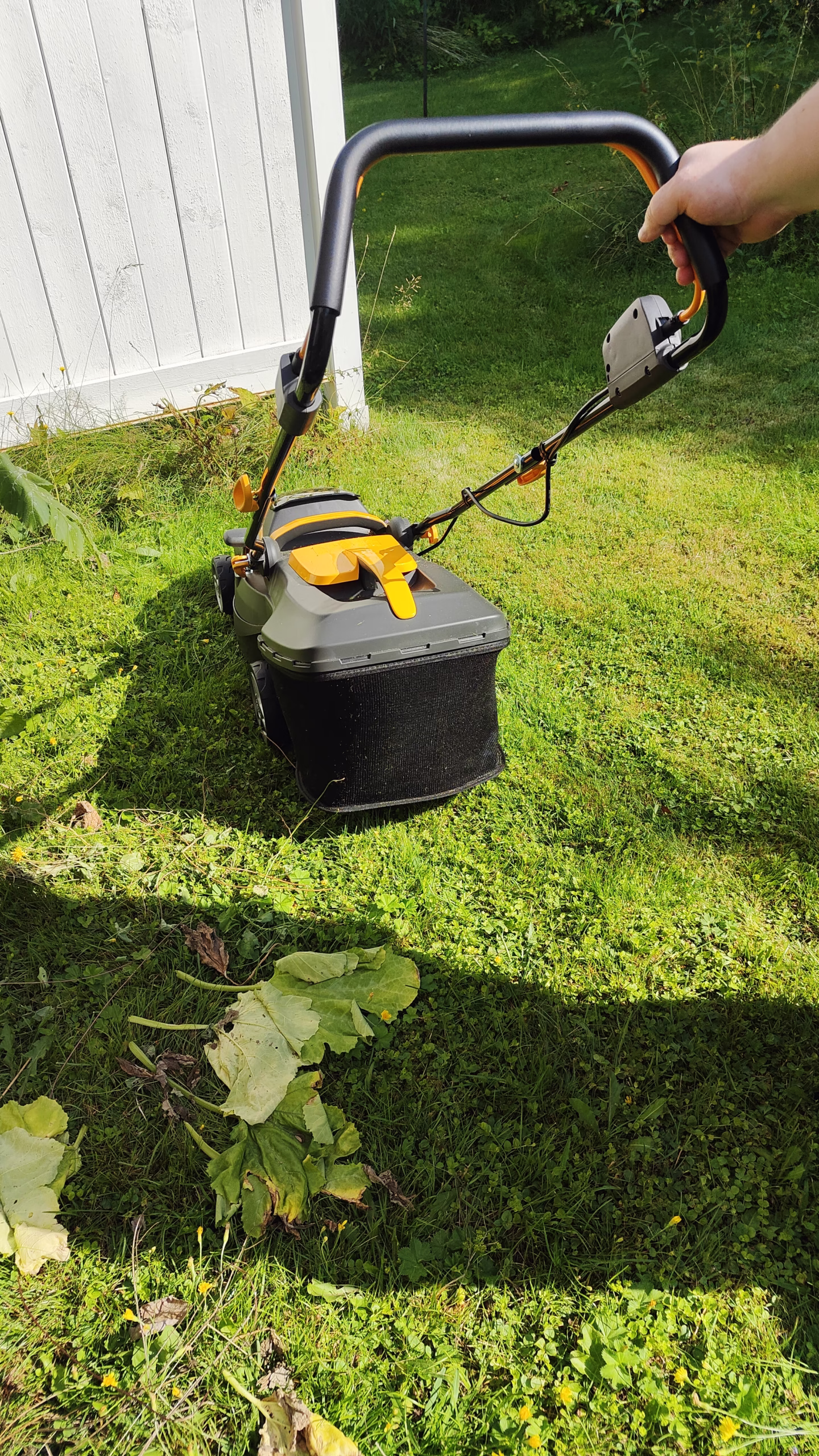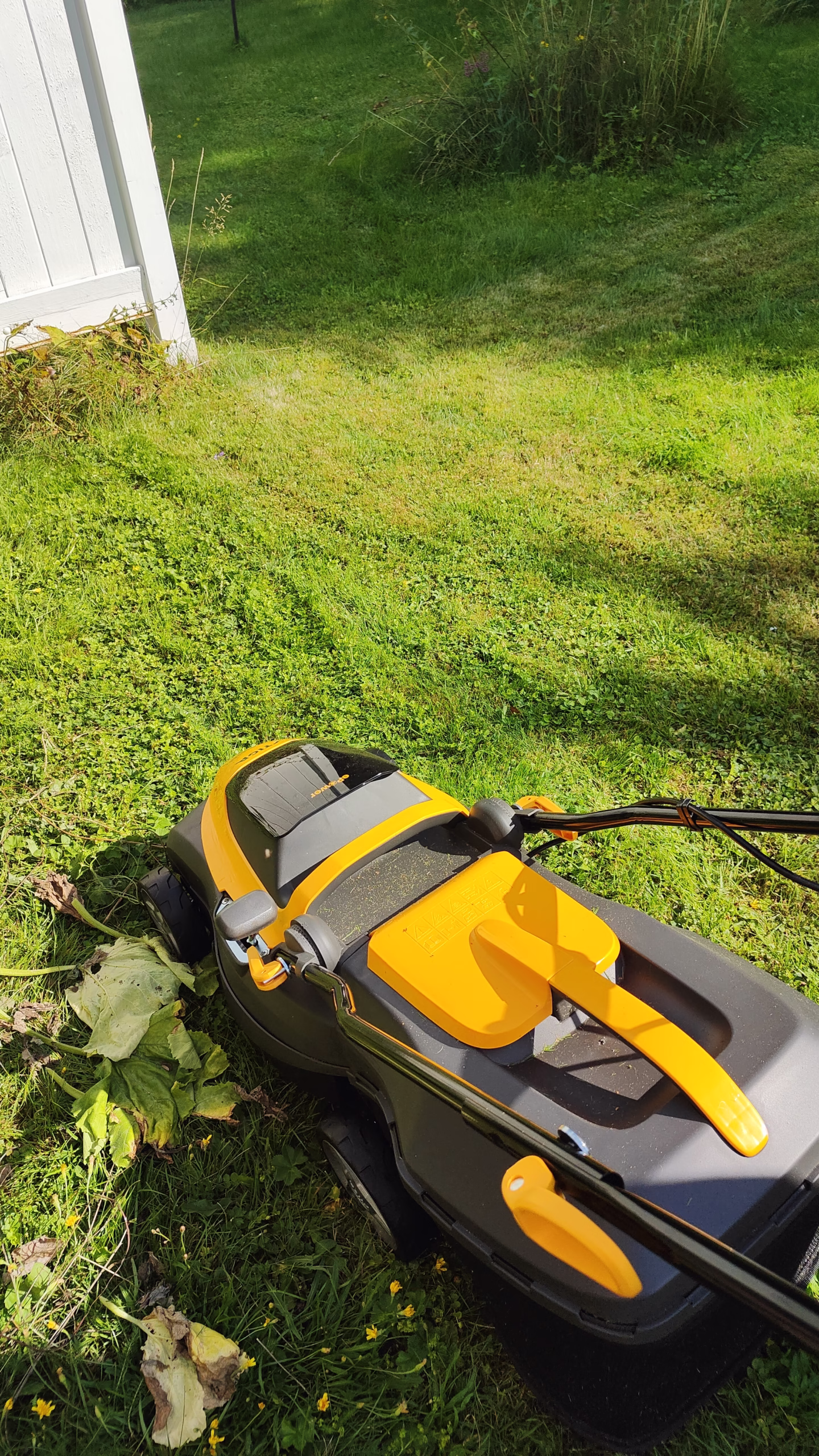 Näin näppärän näköinen on keräävä ruohonleikkuri, jonka maksimi toiminta-alueeksi on ilmoitettu 250 neliötä. Minun sadan neliön nurmialueeni leikkaamisen jälkeen akkuihin jäi jäljelle 3/4 virtaa. Hyvin riittää tuo pieni ruohonleikkuri tämän kokoisen pihan käyttöön.